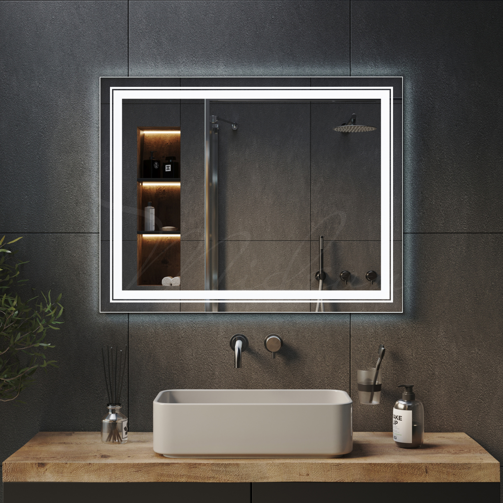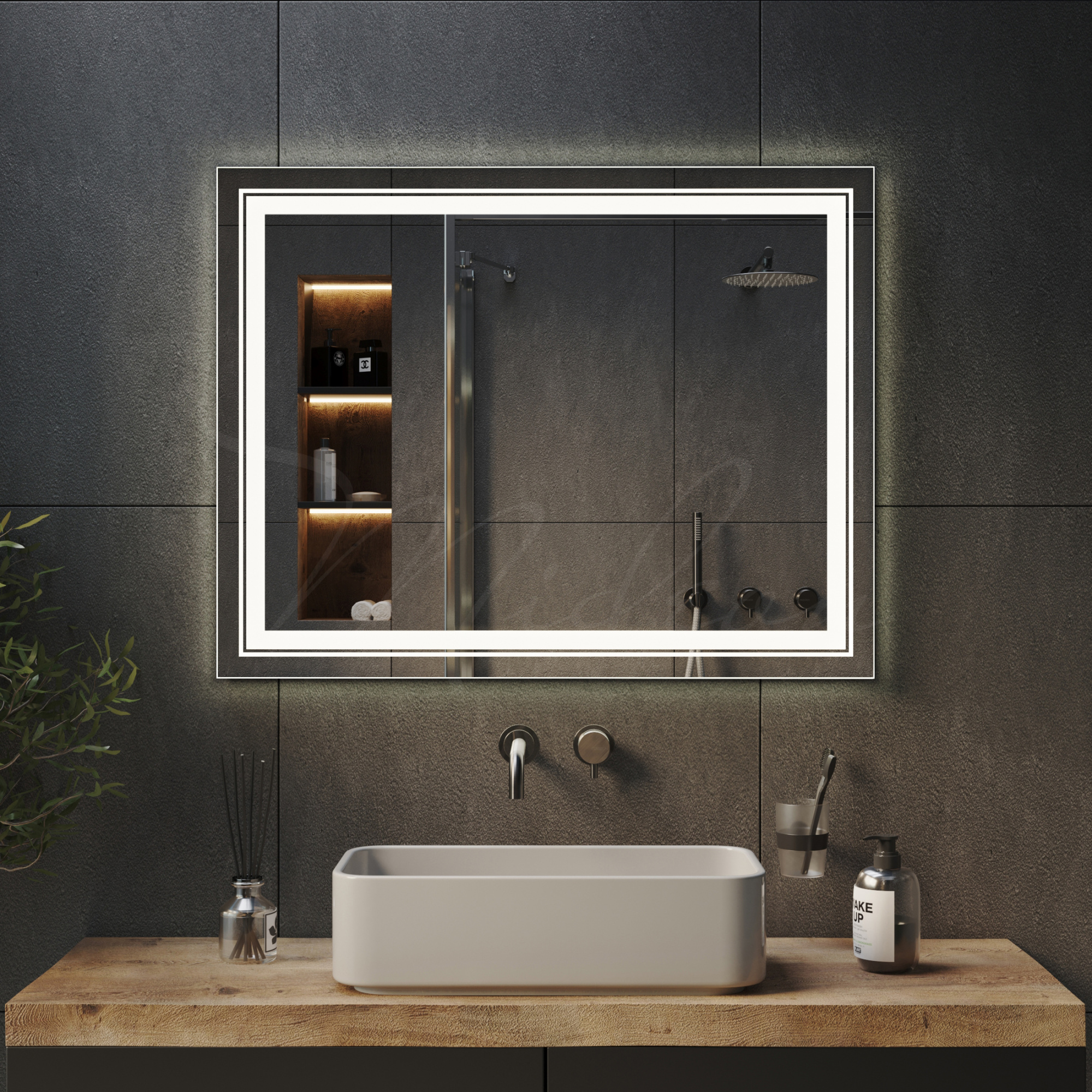 Все наши зеркала с закрытой подсветкой имеют толщину всего 24 мм благодаря применению современной LED (светодиодной) подсветки, премиальных комплектующих и собственным производственным наработкам.